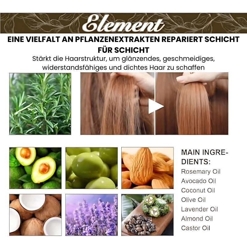 Unsere einzigartige Formel kombiniert die bewährten Vorteile von Arganöl, Rosmarinöl, Kokosnussöl und Rizinusöl. Diese natürlichen Inhaltsstoffe arbeiten zusammen, um deine Kopfhaut zu nähren, das Haarwachstum zu fördern und deinem Haar einen gesunden Glanz zu verleihen