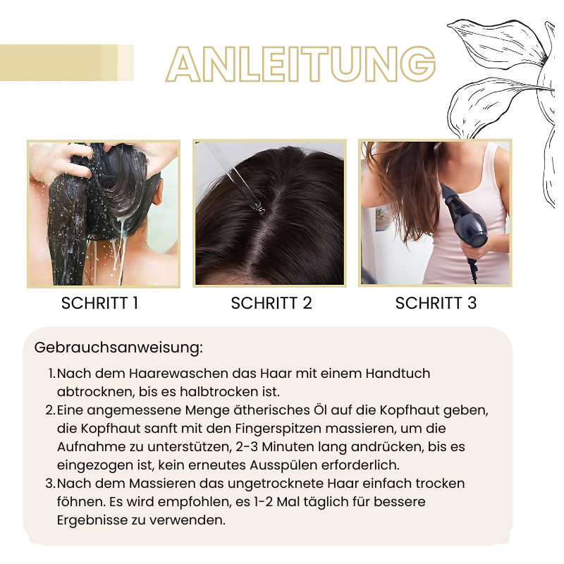 Für beste Ergebnisse solltest du das Öl 1-2 Mal täglich auf deine Kopfhaut auftragen und sanft einmassieren.
